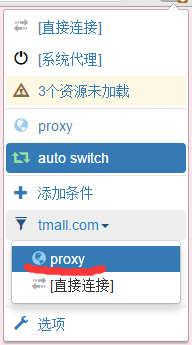 就可以使得这些域名通配符匹配的域名可以通过代理访问,永久的(即以后浏览这些网站都自动使用代理模式)。 除了在选项界面添加条件,也可以在浏览器右上角小图标设置,如下:
